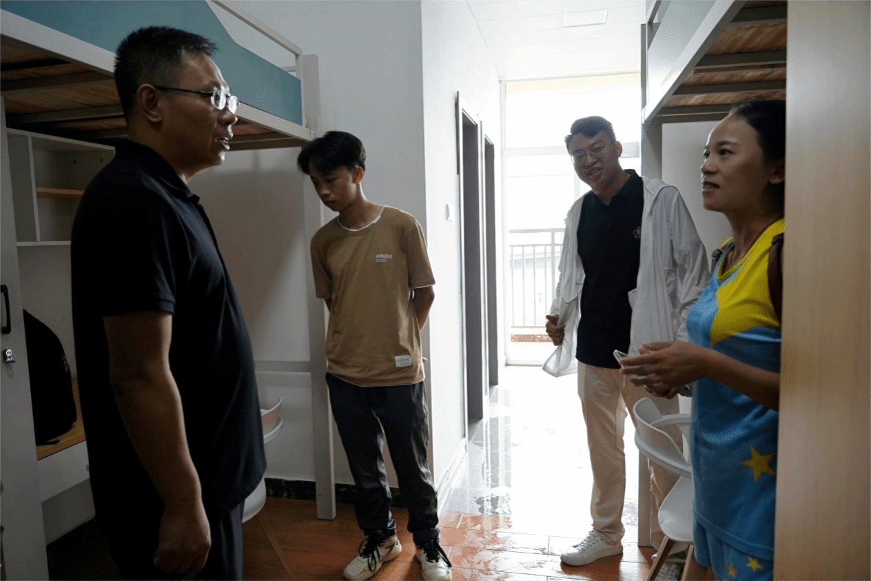 校领导非常关心学生的住宿情况。在检查宿舍过程中,遇到了一位来自崇左的家长。校领导对学生及家长表示深切问候。家长激动地表示:“咱们学校环境很好,住宿条件非常不错,看到孩子们学校这么好,我们也放心了。”