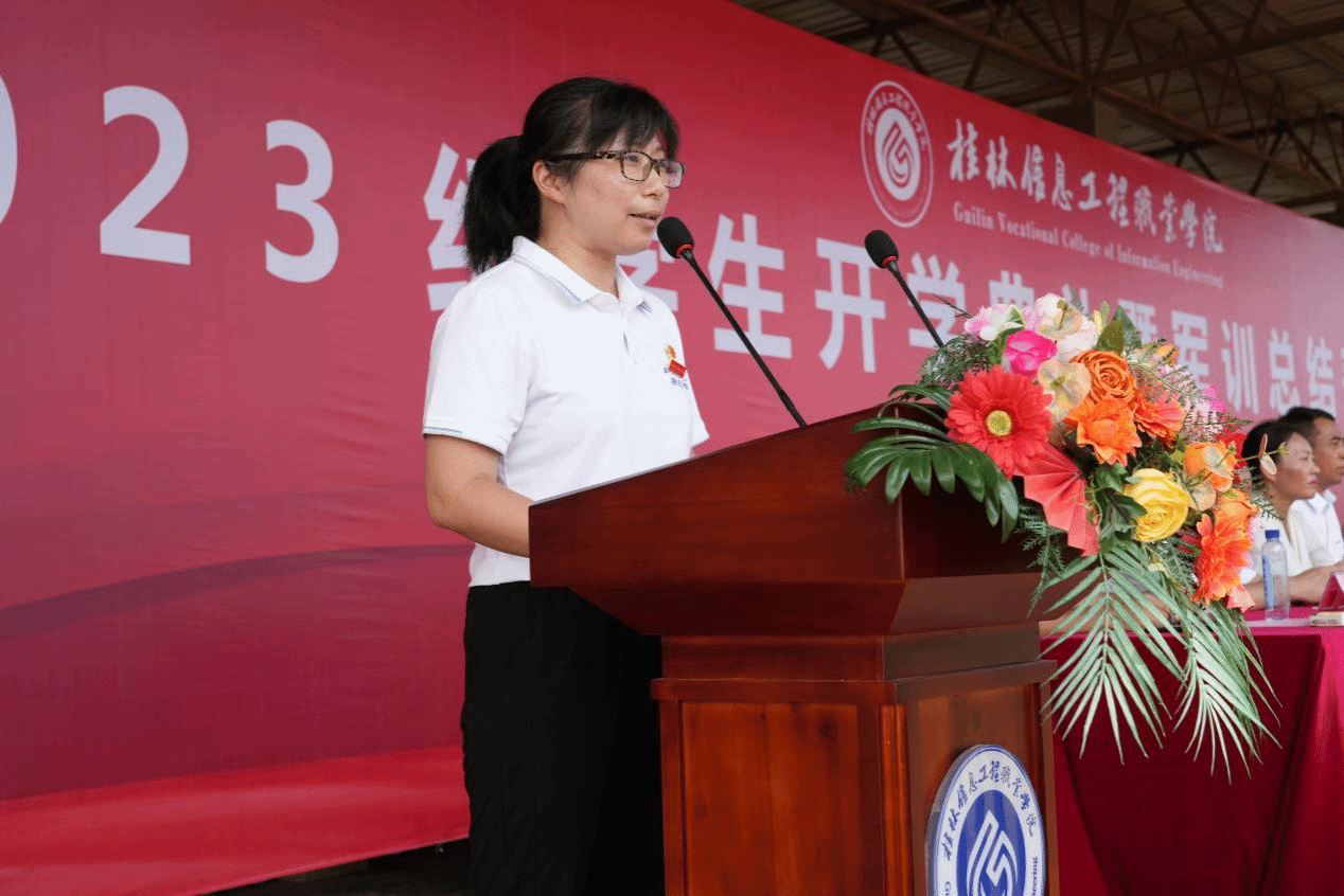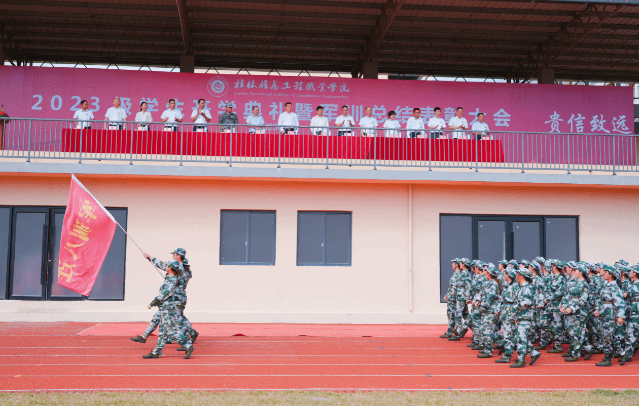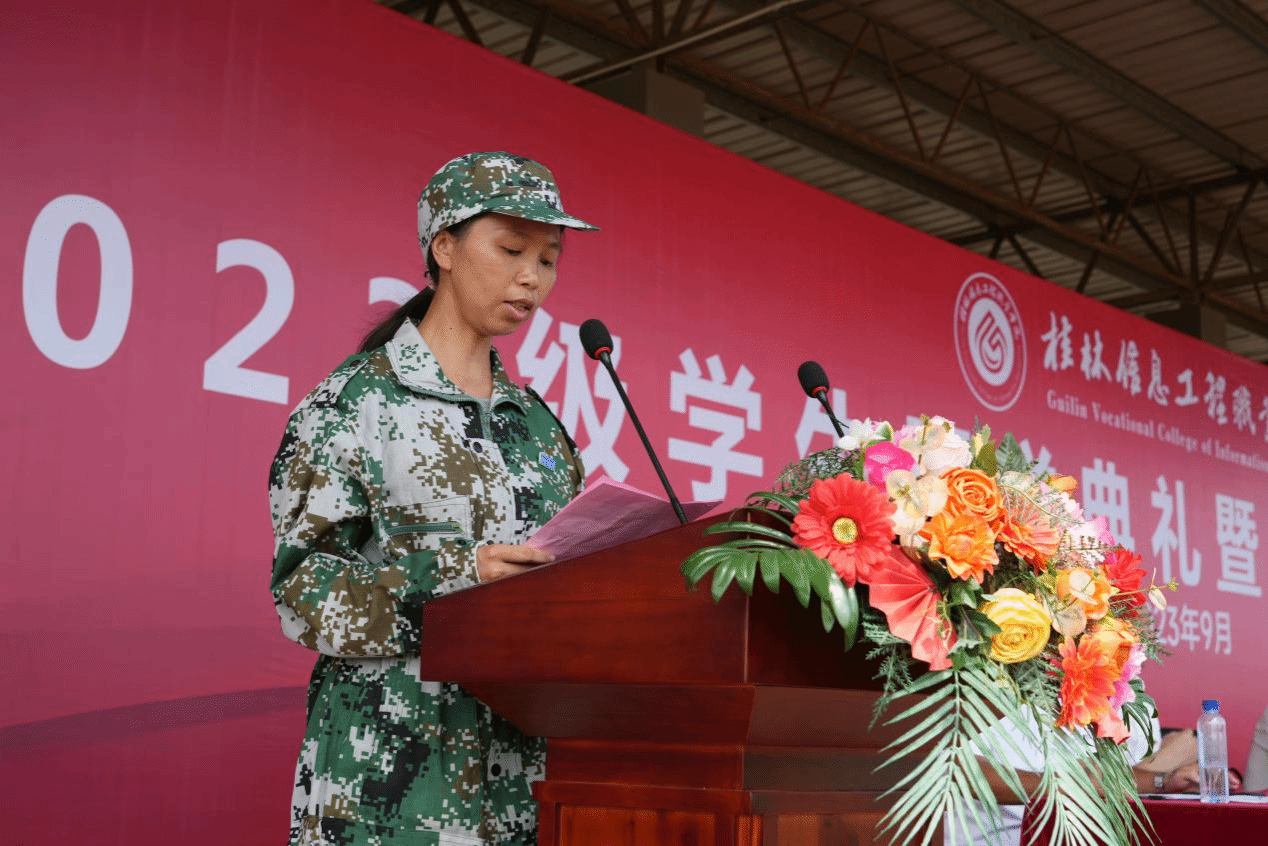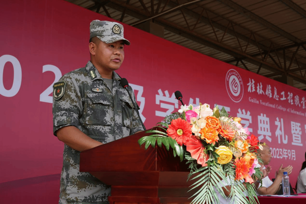 桂林市警备区军训队长马建方作军训工作总结,他表示,过去两周,全体新生按照军训计划,从严训练,在风吹日晒中铸就坚强,在挥洒汗水中收获成长,展现了桂信学子的良好精神风貌。他希望全体新生厚植爱国情怀,坚定理想信念;传承优良作风,砥砺扎实学风;牢记强国使命,锤炼品德修养,争做有理想、敢担当、能吃苦、肯奋斗的新时代好青年。